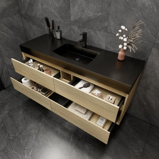 60 Inch Light Brown Wall-Mounted Single Sink Bathroom Vanity with Black Stainless Steel Sink – MEBO MIA MIA60S-TW