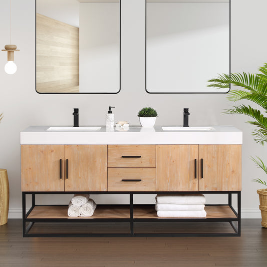 72 Inch Light Brown Double Sink Bathroom Vanity with Matte Black Support Base and White Engineered Stone Countertop – Altair 552072B-LB-WH-NM