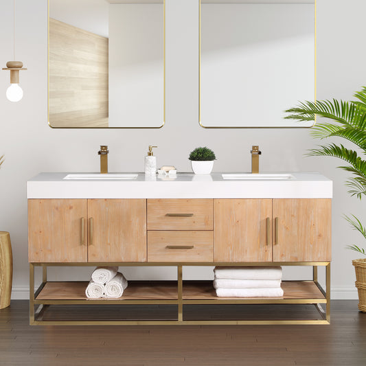 72 Inch Light Brown Double Sink Bathroom Vanity with Grain White Engineered Stone Countertop - Altair Gavino 557072-LB-GW-NM