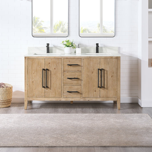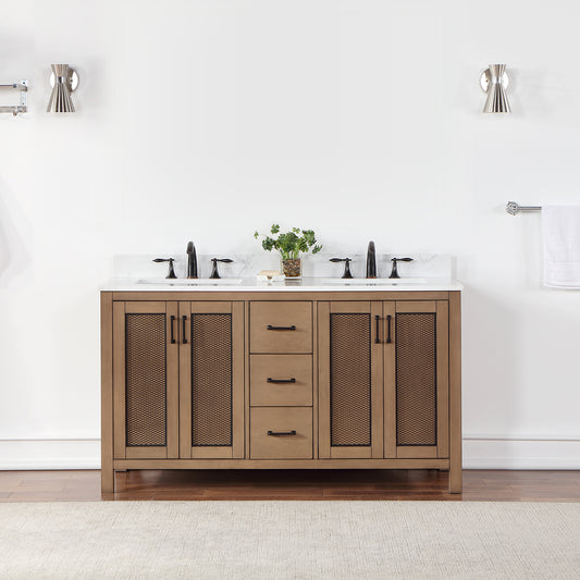 60 Inch Brown Double Sink Bathroom Vanity with Calacatta White Quartz Countertop - Altair Solana 560060-WF-CWQ-NM