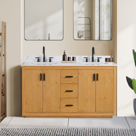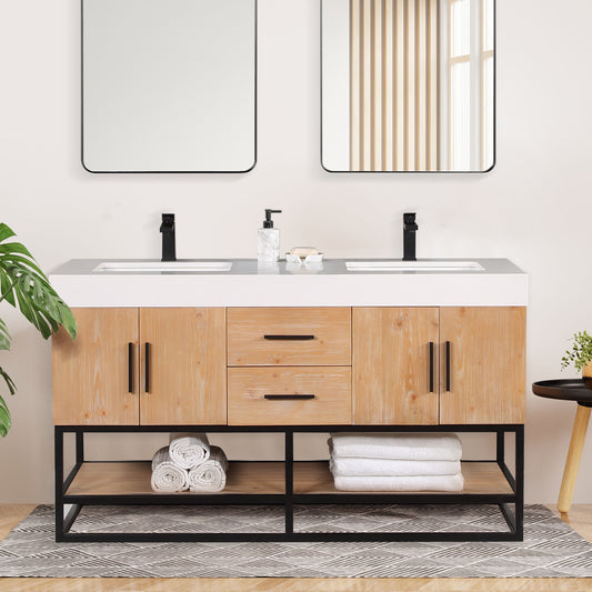 60 Inch Natural Wood Double Sink Bathroom Vanity with Grain White Engineered Stone Countertop - Altair Perla 556060-NW-GW-NM