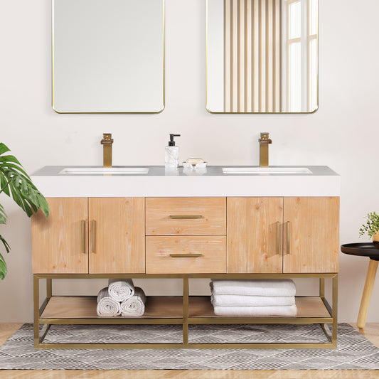 60 Inch Light Brown Double Sink Bathroom Vanity with Grain White Engineered Stone Countertop - Altair Gavino 557060-LB-GW-NM