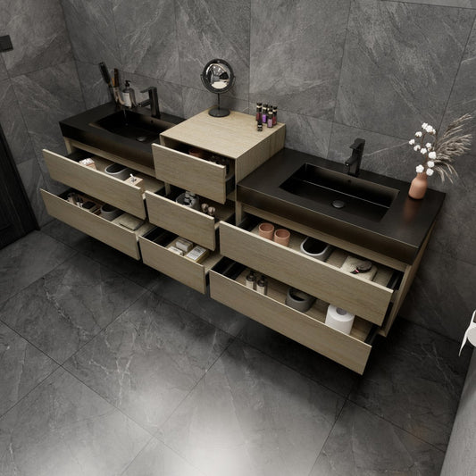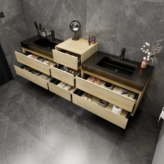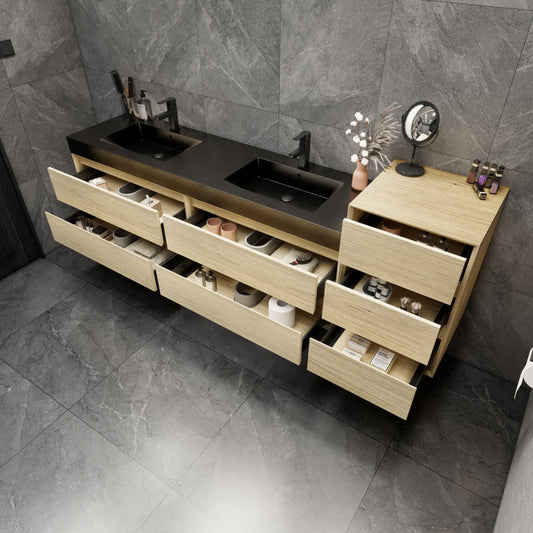 92 Inch Light Brown Wall-Mounted Double Sink Bathroom Vanity with Black Stainless Steel Sink – MEBO MIA MIA92-TW