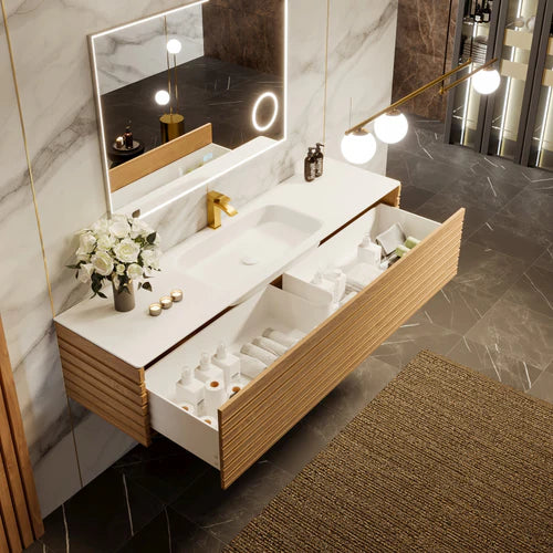 55 Inch Oak Wall Mounted Single Sink Bathroom Vanity with White Solid Surface Top - Allure EVVN128-55OAK