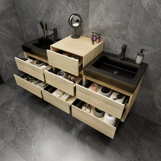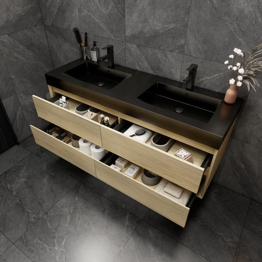 60 Inch Light Brown Wall-Mounted Double Sink Bathroom Vanity with Black Stainless Steel Sink – MEBO MIA MIA60D-TW