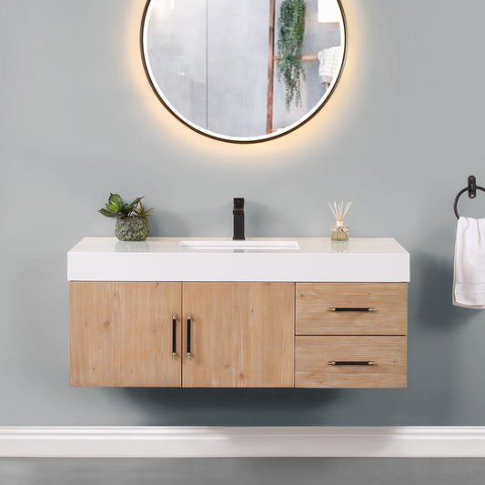 48 Inch Light Brown Wall-Mounted Single Sink Bathroom Vanity with White Engineered Stone Countertop - Altair Corchia 553048-LB-WH-NM