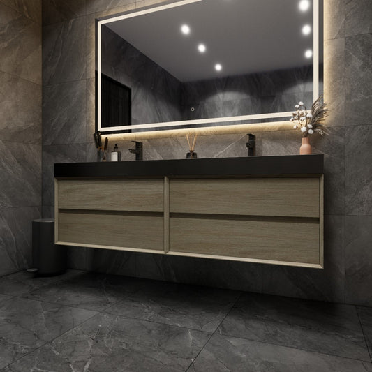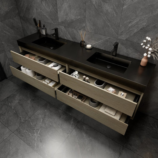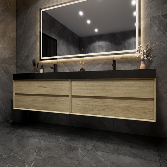 84 Inch Light Brown Wall-Mounted Double Sink Bathroom Vanity with Black Stainless Steel Sink – MEBO MIA MIA84D-TW