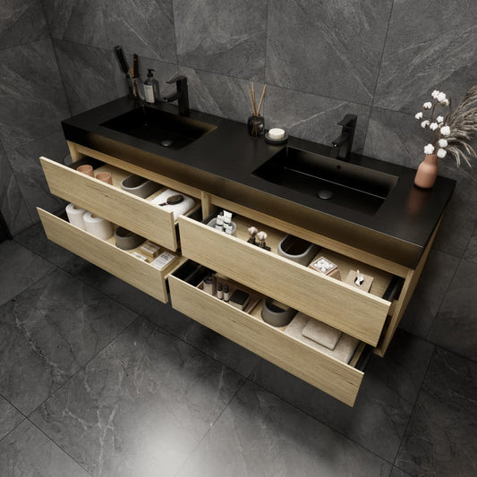 72 Inch Light Brown Wall-Mounted Double Sink Bathroom Vanity with Black Stainless Steel Sink – MEBO MIA MIA72D-TW